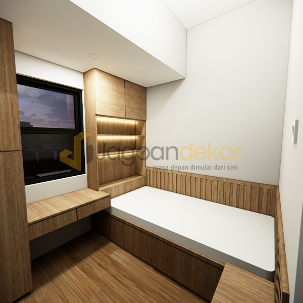 Ubah kamar tidur Anda menjadi ruang yang luar biasa fungsional tanpa mengorbankan estetika. Sistem furnitur terintegrasi ini dirancang khusus untuk memaksimalkan setiap inci ruangan, menggabungkan area istirahat, area kerja, dan penyimpanan masif dalam satu kesatuan desain yang harmonis.
