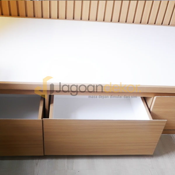 Finishing: High Pressure Laminate (HPL) motif kayu Natural Oak yang memberikan tekstur serat kayu asli, tahan gores, tahan panas, dan sangat mudah dirawat.