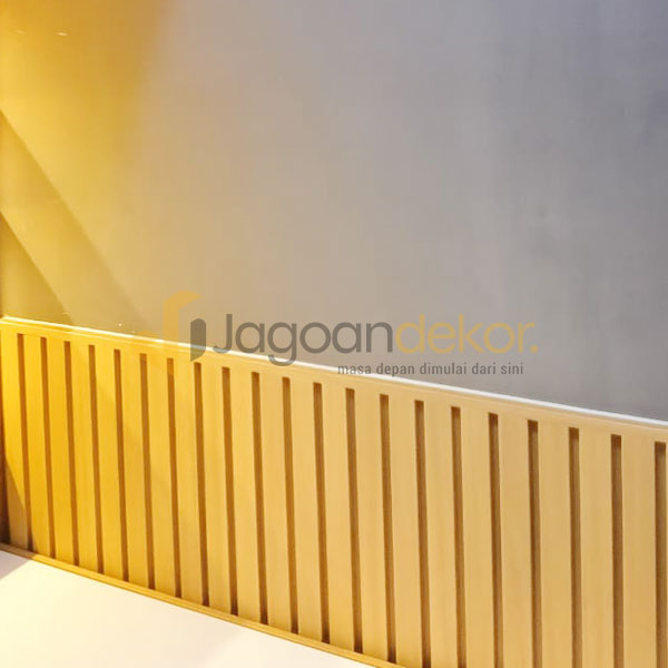 Wall Panel Estetik: Panel dinding motif garis vertikal yang memberikan dimensi visual pada ruangan, sekaligus melindungi dinding asli dan memberikan kesan mewah ala hotel berbintang.