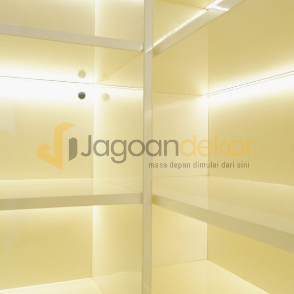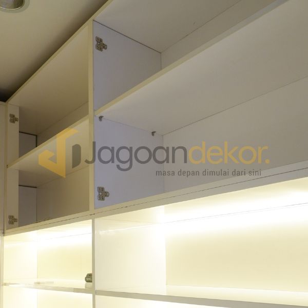 Yellow Ambient Backlight: Integrasi lampu LED berwarna kuning hangat (Warm White) pada sela-sela kabinet menciptakan efek kedalaman yang dramatis. Pencahayaan ini tidak hanya memudahkan pencarian barang, tetapi juga meningkatkan nilai estetika ruangan di malam hari.