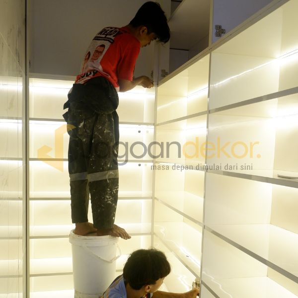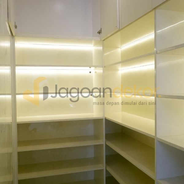 Ingin memiliki Lemari Wardrobe Letter L dengan pencahayaan mewah seperti ini? Segera hubungi tim Jagoan Dekor untuk survey lokasi, konsultasi desain gratis, dan penawaran harga terbaik!