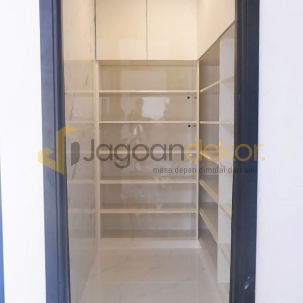 Full Ceiling Storage: Konstruksi kabinet yang menyentuh plafon menghilangkan celah debu di bagian atas sekaligus memberikan ruang ekstra untuk menyimpan barang-barang musiman (koper, bedcover, dll).